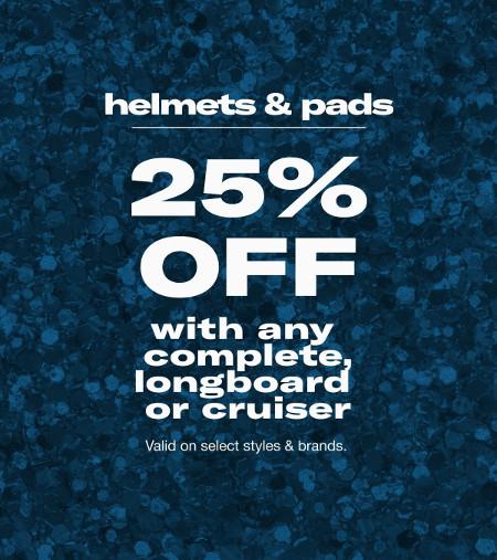 25% off Helmets and Pads with Any Complete, Longboard or Cruiser
